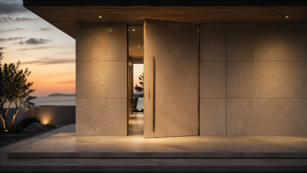 Cuando está bien resuelta, una puerta pivotante puede quedar prácticamente al ras de la envolvente, alinearse con los despieces del revestimiento y formar parte de una fachada limpia, elegante y contemporánea. El resultado transmite algo muy valioso en el sector premium: sensación de control, detalle y arquitectura bien pensada.