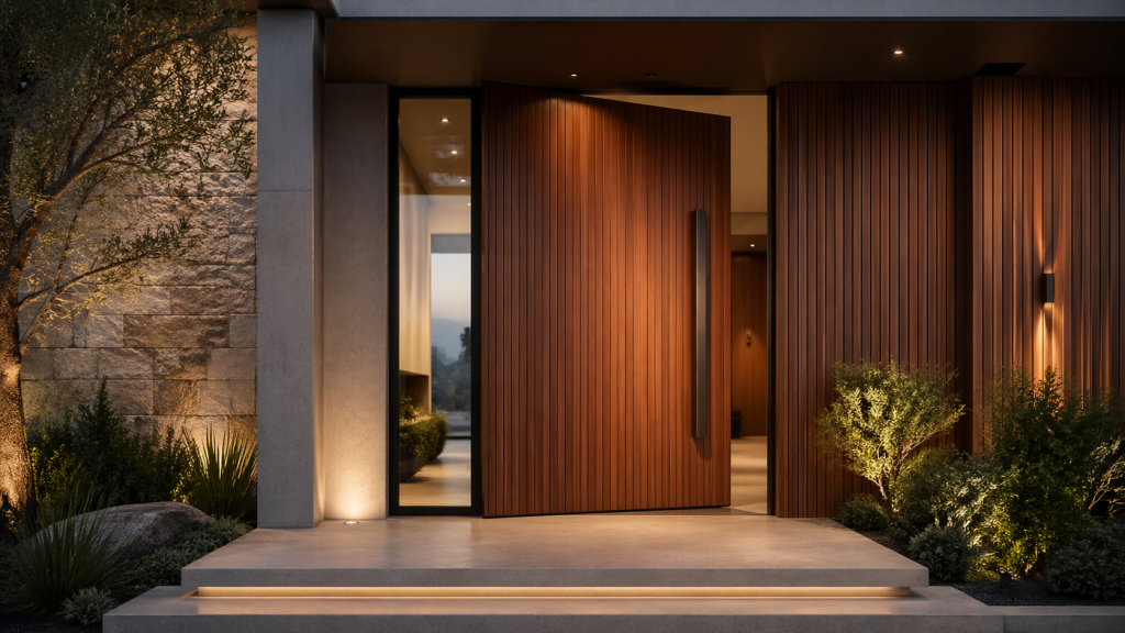 Frente a una puerta convencional, el sistema pivotante permite trabajar con hojas de mayor protagonismo y con una lectura mucho más limpia. Además, genera un gesto de apertura especialmente interesante en viviendas de alta gama, estudios de arquitectura, espacios corporativos o proyectos donde el acceso forma parte de la experiencia estética.