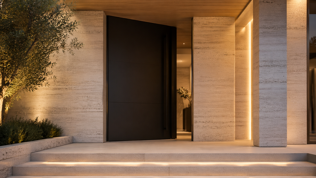 Aquí es donde entra en juego uno de los recursos más sofisticados del diseño actual: la puerta pivotante integrada en fachada. Hablamos de soluciones capaces de ofrecer presencia, escala y seguridad, pero al mismo tiempo desaparecer visualmente dentro del revestimiento. No se trata solo de instalar una puerta grande. Se trata de lograr continuidad visual, orden compositivo y una ejecución técnica impecable.
