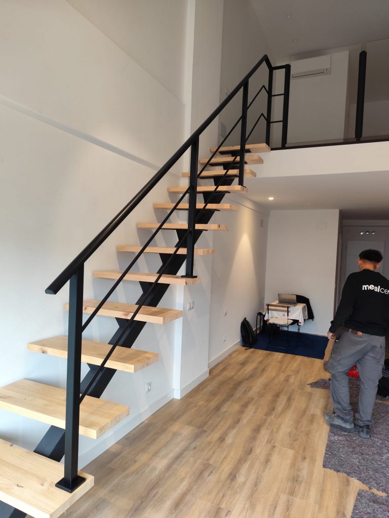 En este proyecto desarrollado por Metalcer en San Sebastián de los Reyes, el objetivo fue claro: diseñar e instalar una barandilla metálica a medida que acompañara la escalera principal de un loft de doble altura, aportando seguridad y coherencia estética al espacio.